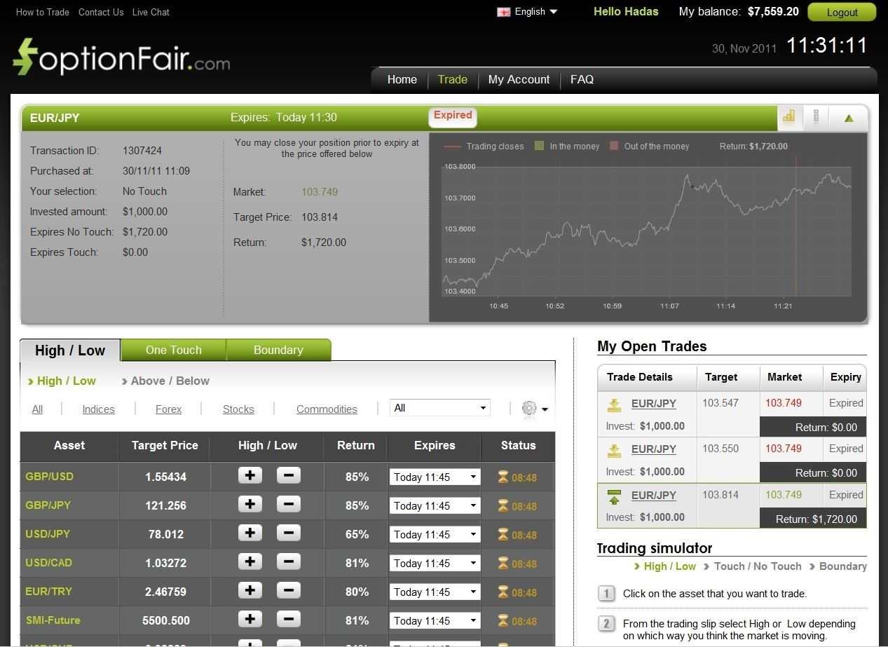I placed $1,000 on “No Touch” instrument at optionFair™ Binary Options Trading Platform, so that if this option expires without touching the strike price, I will receive a 72% return, or $720 on my investment. At the buying time, 11:09, the EUR/JPY traded at 103.814 and the target price was 103.814 at the expiry time of 11:09. The market was below the strike price therefore I earned $720.