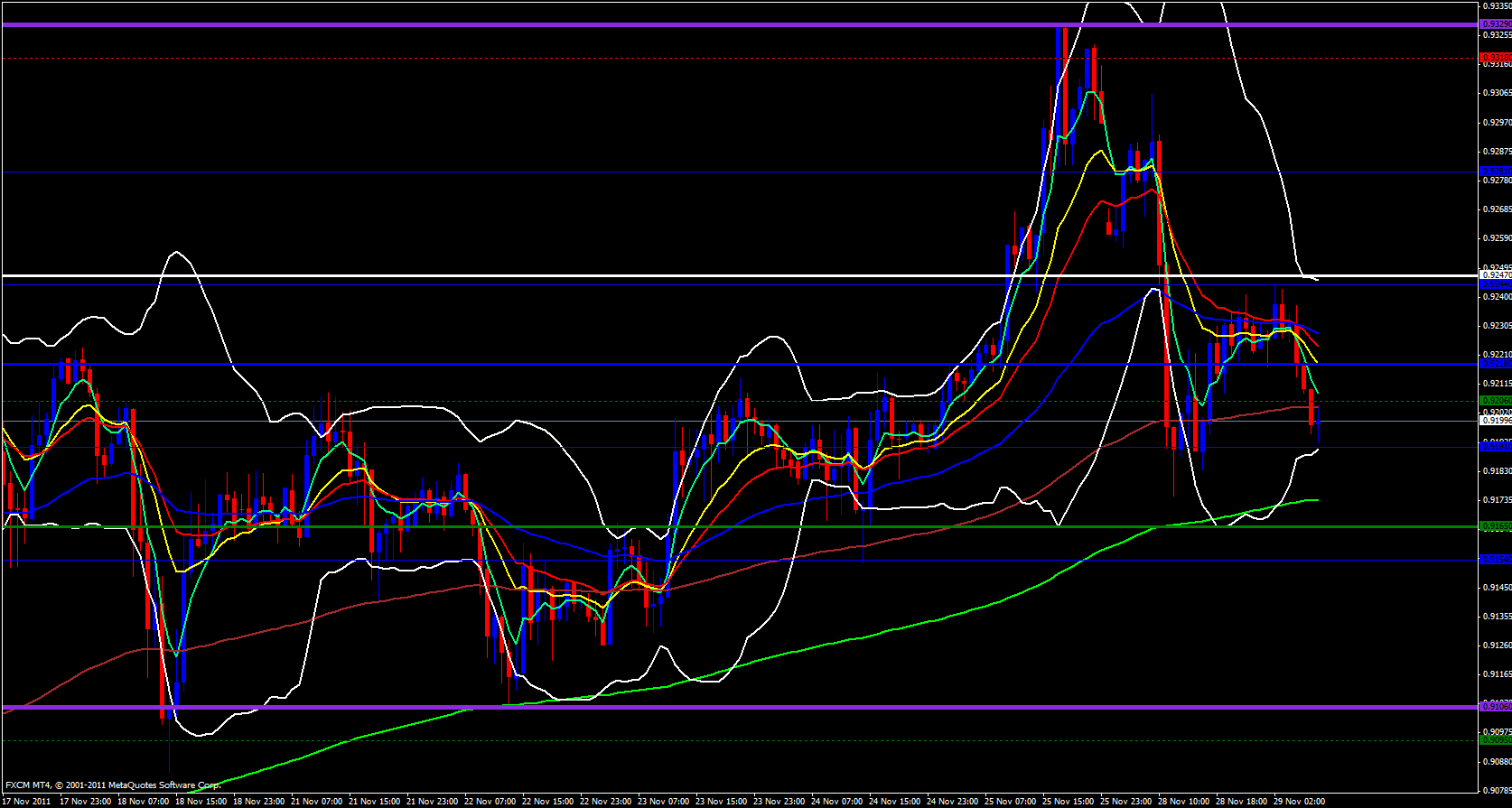 Yesterday price made its way up to the .9300 region where I said it will most likely encounter resistance then drop and sure enough it dropped. Price went as high as .9306 then tanked over 100 pips. At this time price is sitting right on a support line that will either trigger a bounce to the upside that will bust previous levels or a break below the trend line to the down side that should keep price falling. The daily 5 ema is beginning to roll over to the downside and the angle and separation between the 5 and 13 ema's is not so strong anymore.