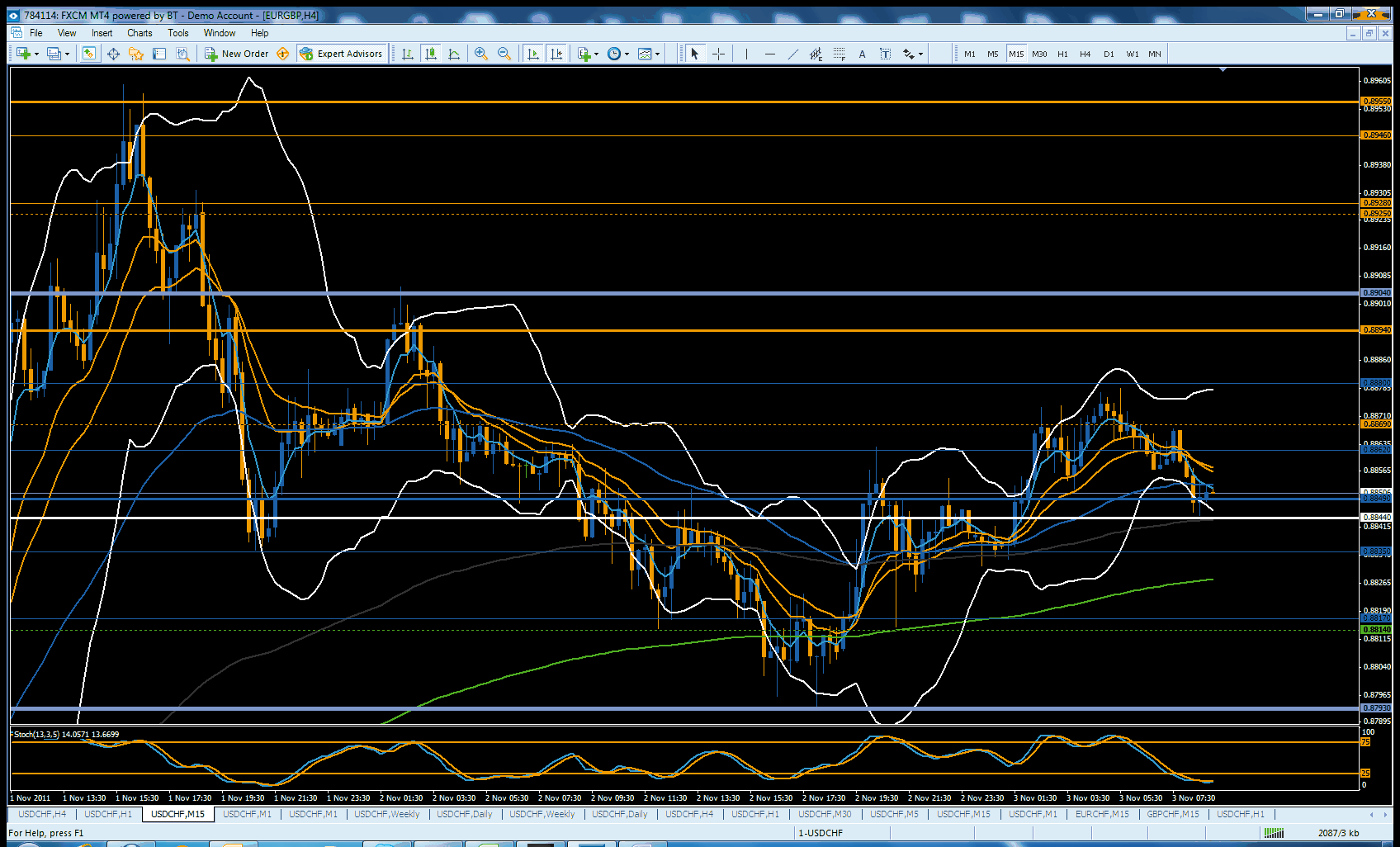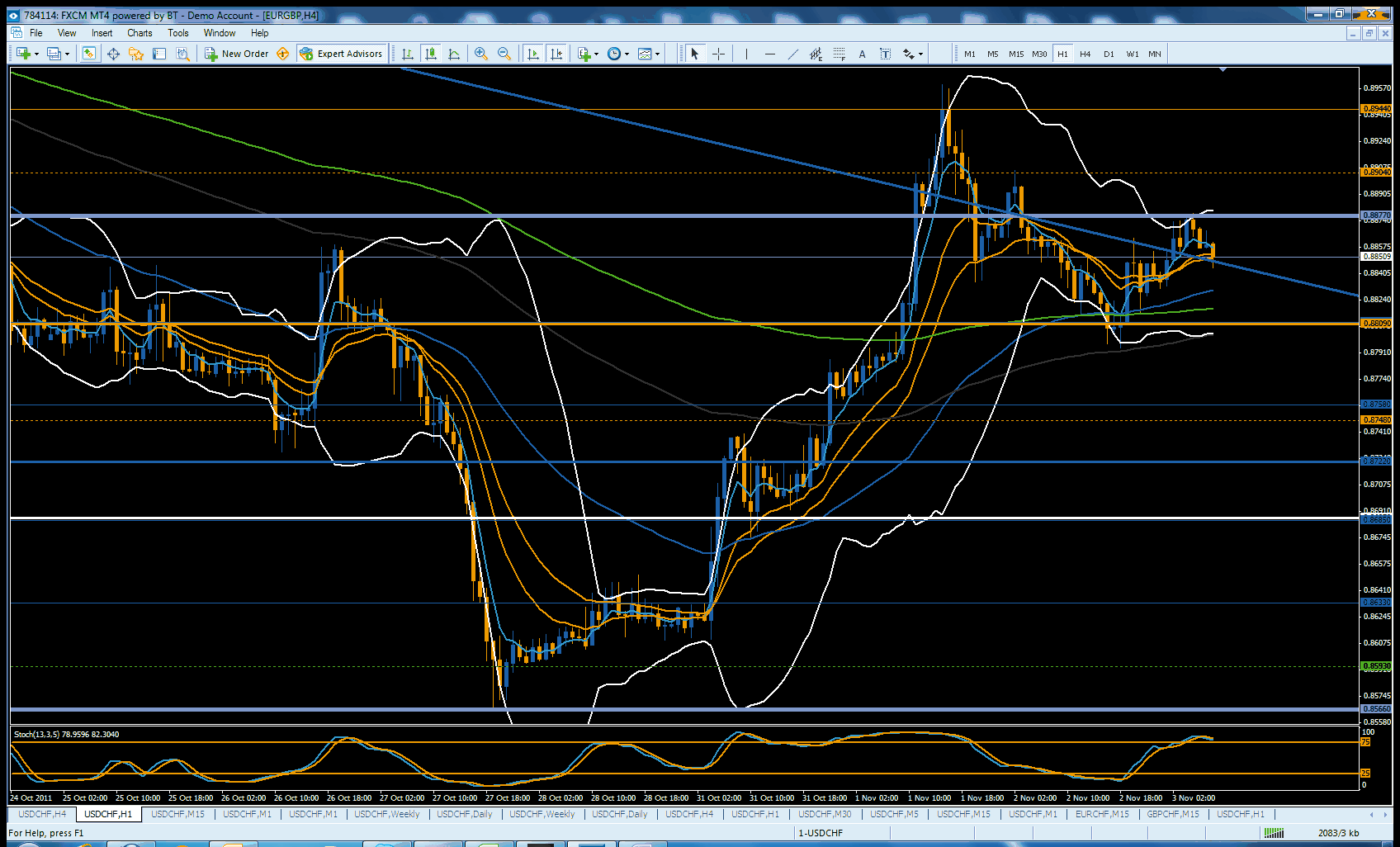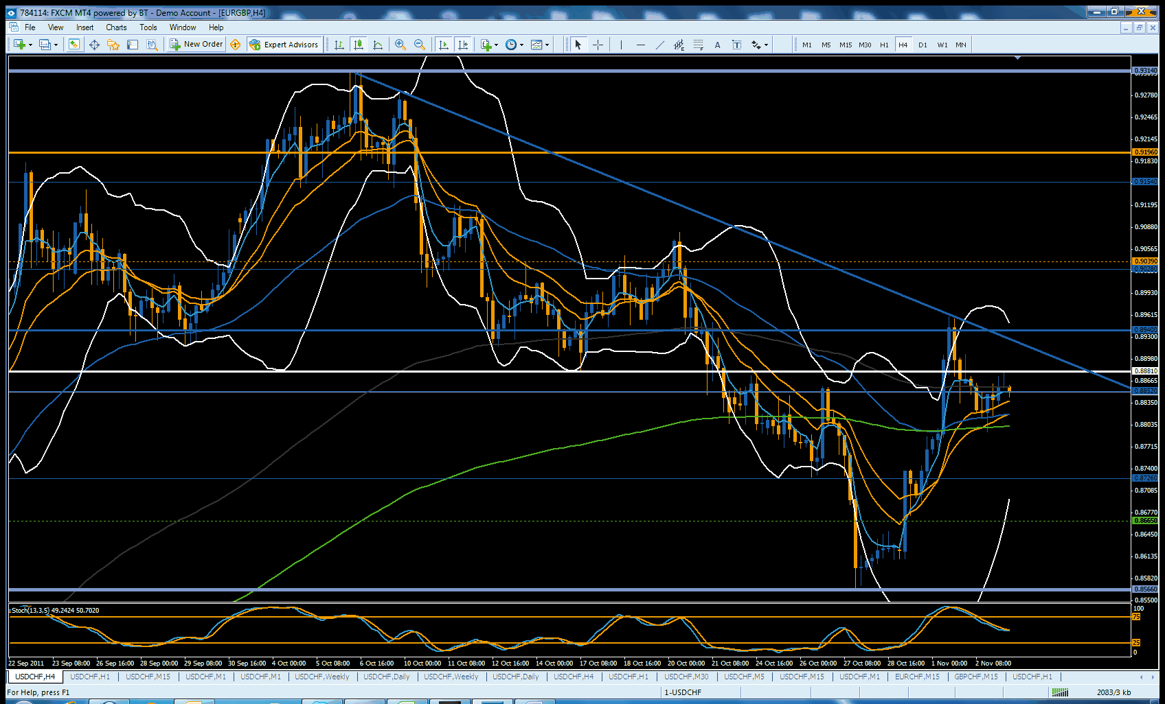 On the USD/CHF daily chart for the Swissy price is currently being crunched between the 5 and 21 ema's with the 233 and a trend line just above.
