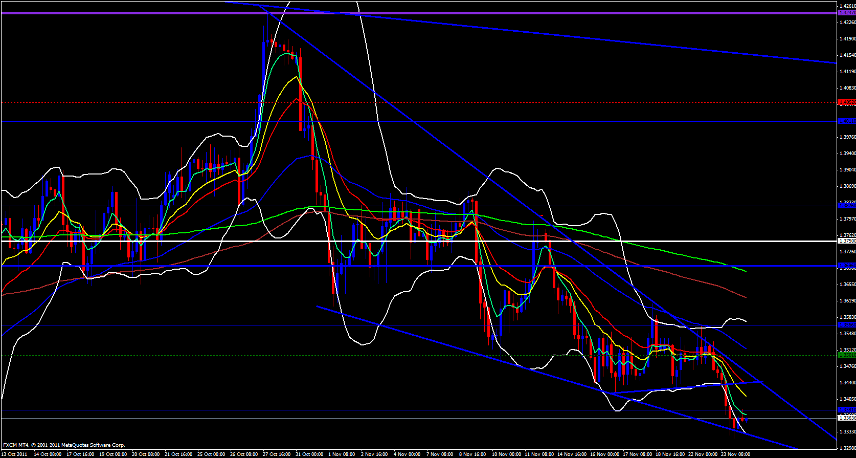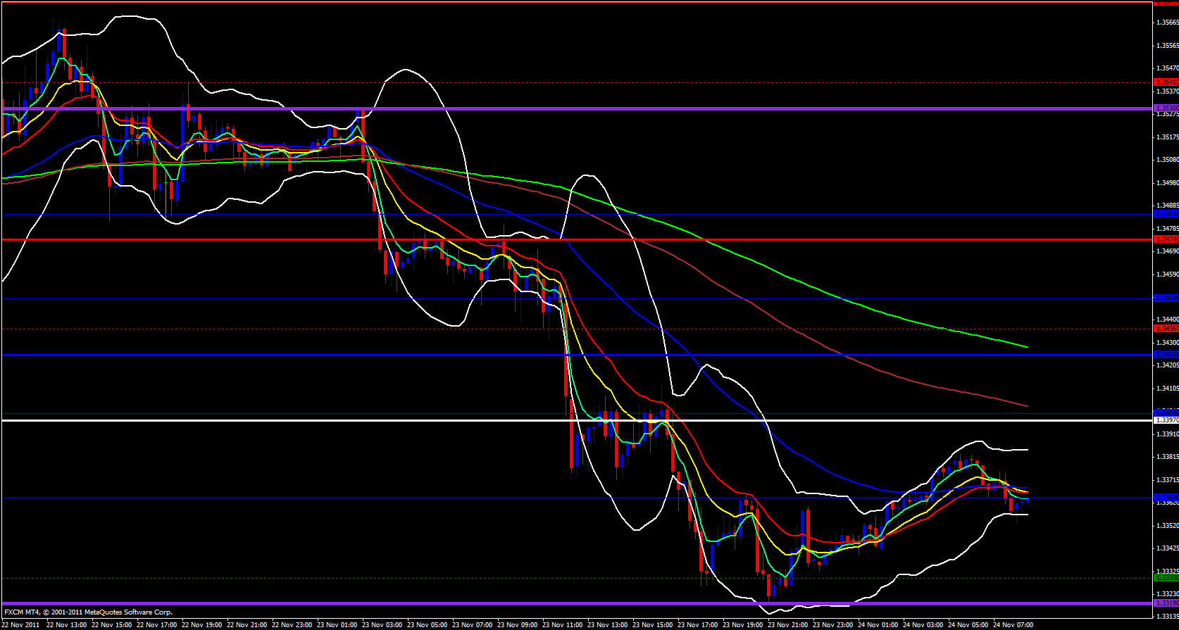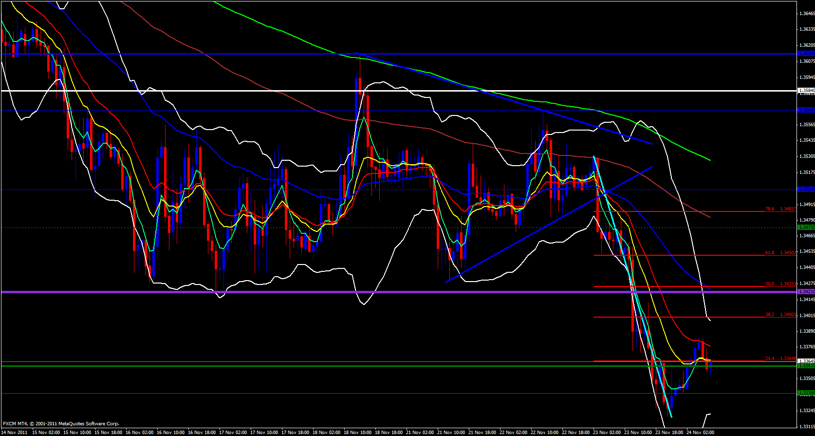 Price recently rose up and kissed the 21 ema then dropped but has now made a reverse fib which could force price upward, however, stochastics is on the oversold zone pointing down so I guess we will just have to wait and see what will happen. It could also turn out to be just a range bound night due to the American holiday.