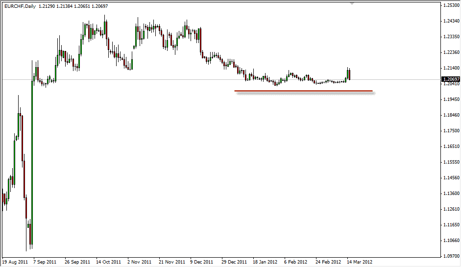 Looking very similar to the EUR/USD, we see that the weekly candle in AUD/USD is a hammer as well. The parity level has held up as support again, and the Aussie enjoys the benefit of being a “risk on” currency, so it makes sense that we saw a large bounce later in the week. The hammer looks tempting, but as you can plainly see, the 1.05 is a serious are for resistance. The 1.07 above is the top of major resistance, and in order to get massively bullish, we would have to see a close above that level. In the mean time, expect headlines to push and pull this pair over the next week and beyond. If we could close on a daily chart below parity, this pair becomes a massive sell at that point.