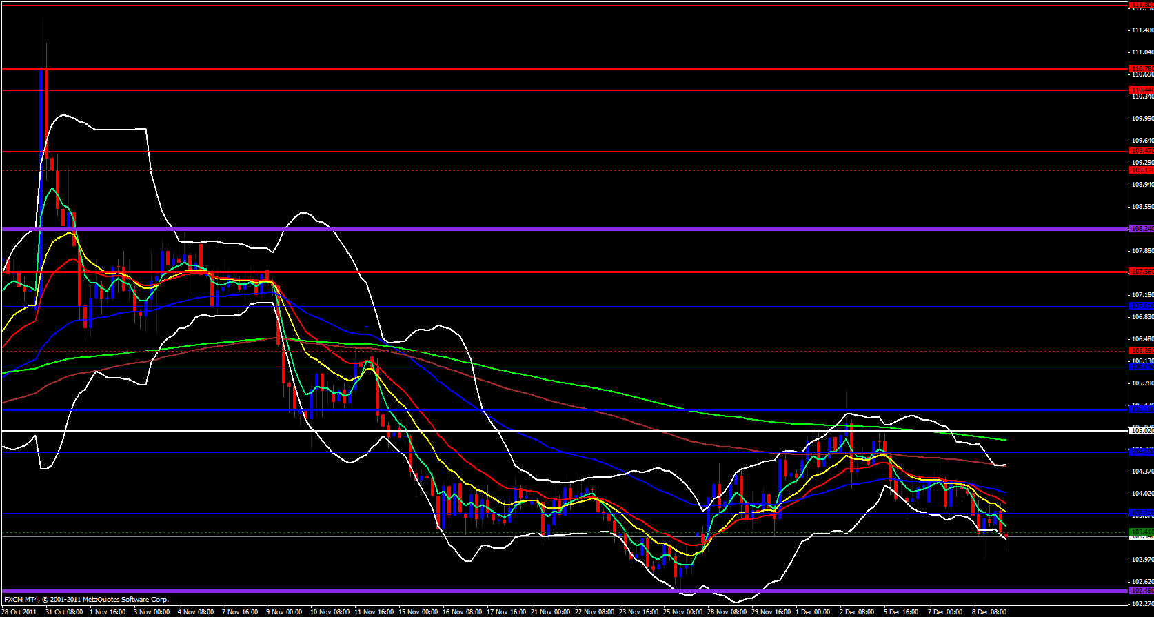 Moving on to the hourly time frame price is riding the 5 ema to the downside and the 5 ema has crossed below the 13 ema and the lower Bollinger band is pointing down. The weekly S1 pivot is at 103.02 and a bounce is expected at that level offering a small scalp to the upside then a good opportunity to enter a short position.