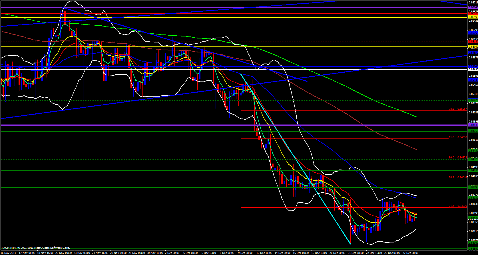The lower Bollinger band is closing in to the upside and pointing North so we will watch for a series of higher highs and higher lows on the lower timeframes. Breaks above .8365 with a retest is bullish and a break below .8300 is bearish.