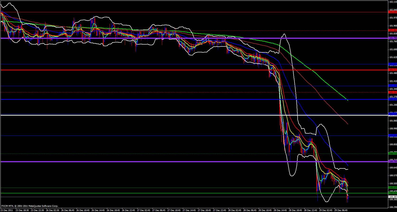 Finally, on the15 minute timeframe price is also extended outside the lower Bollinger band and price has already made its way below the daily S1 at 100.42 but I would like to see a retracement up to the 15 minute 21 ema around 100.50 to get in on this short and preferable as high as 100.65 which would be a kiss of the 15 minute 55 ema.
