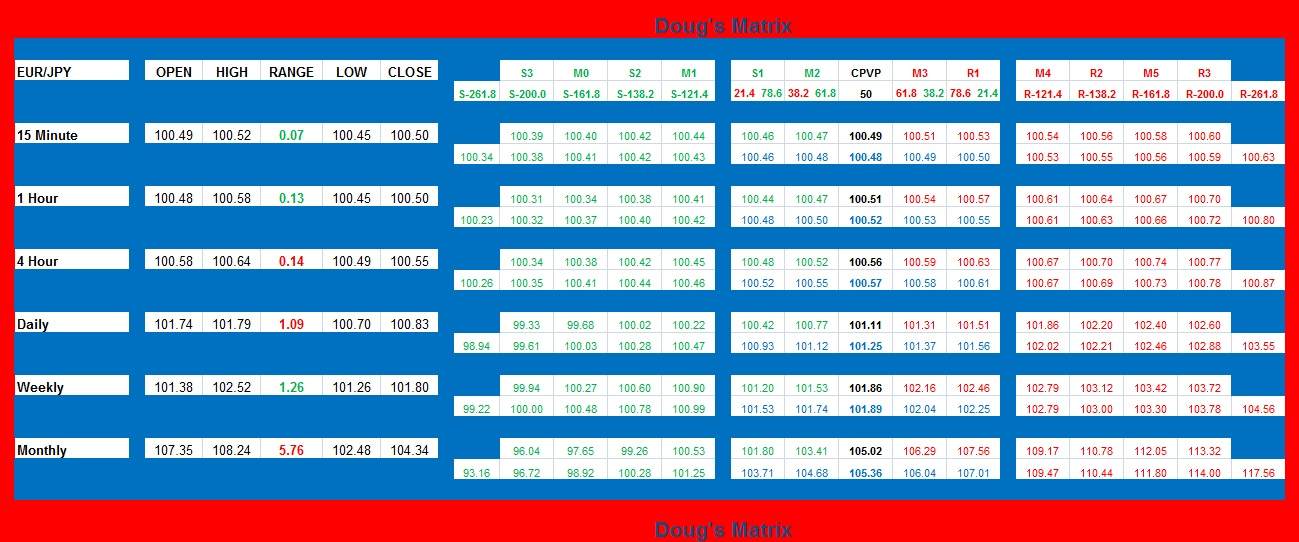 On the hourly timeframe price continues to fall and ride the 5 ema to the downside. I would like to see price retrace back up to the weekly S2 at 100.60 so that I can take a position short. At this time price has fallen too far too fast to grab a short, we need a retracement to a reasonable area of resistance to take this pair down further.