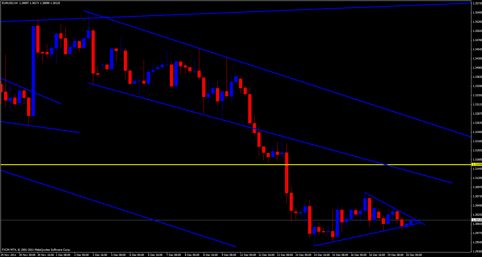 On the daily time frame this pair has made a couple higher lows and a couple lower highs which is another way of describing a triangle pattern if you can visualize that but to me it is just consolidation. Generally after steep moves like the ones we experienced last week price has a tendency to consolidate and go range bound for a bit giving the ema's on the longer term time frames to catch up with price and in this case push it down further. As bearish as I am on this pair and bullish on the Swissy which is the reciprocal of the EUR/USD I cannot help to still think that price may have to retrace up a bit before continuing to the downside and the daily stochastics is in the oversold zone.
