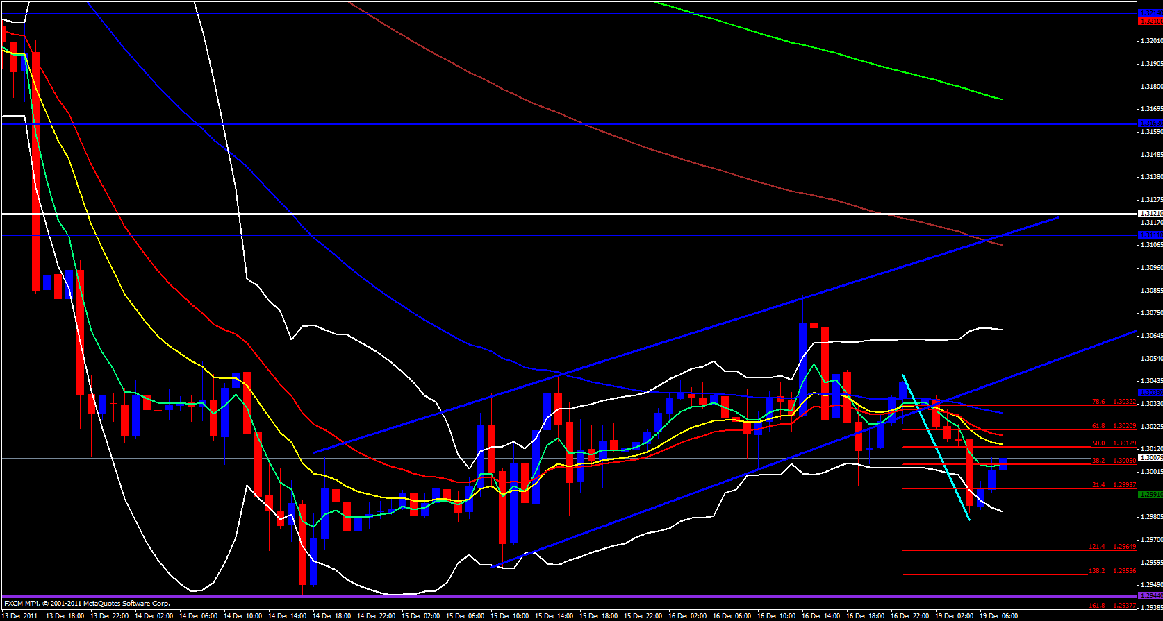 On the 15 minute time frame price is at a 50.0 fib of the recent swing down and it is overlapped with the 55 ema and this is strong resistance so if price breaks above the 55 ema it still has the 144 shortly above and the 233 ema not too much further than that. Above 1.3050 I will be watching for longs, under 1.2980 I will be watching for shorts