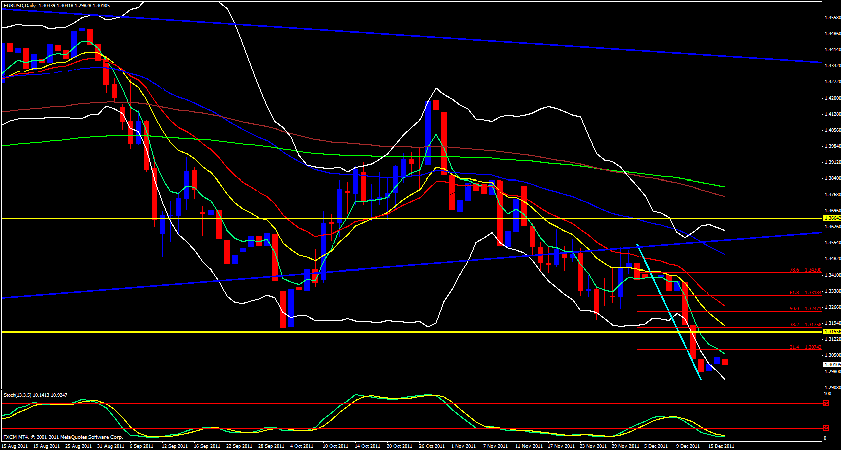 The new weekly candle for the EUR/USD opened up over 100 pips below the weekly 5 ema. Last week's weekly candle printed at the lower Bollinger band. The EUR/USD will continue to drop, but before it can continue its fall it will need to retrace its way back up to the weekly 5 ema in order to keep heading down and the stochastics is in the oversold zone.
