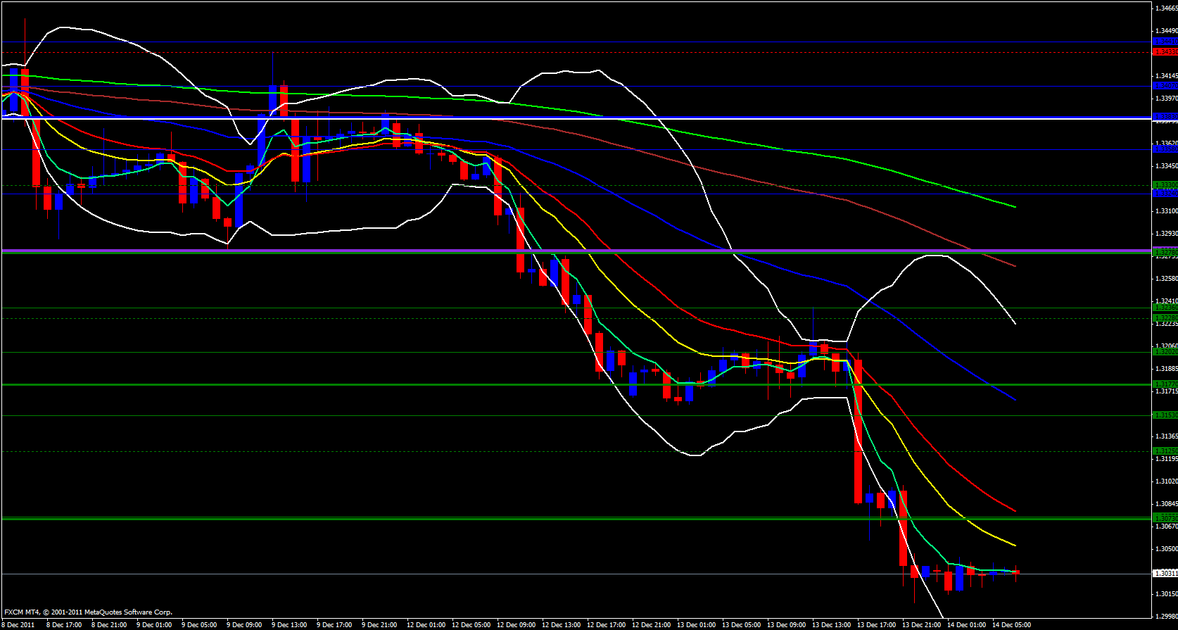 Finally, as I mentioned already the price action on the 15 minute time frame is caught within a tight Bollinger band squeeze waiting for release in either direction. Price is still below the 55 ema's on all time frames which means this pair still has further down yet to go.