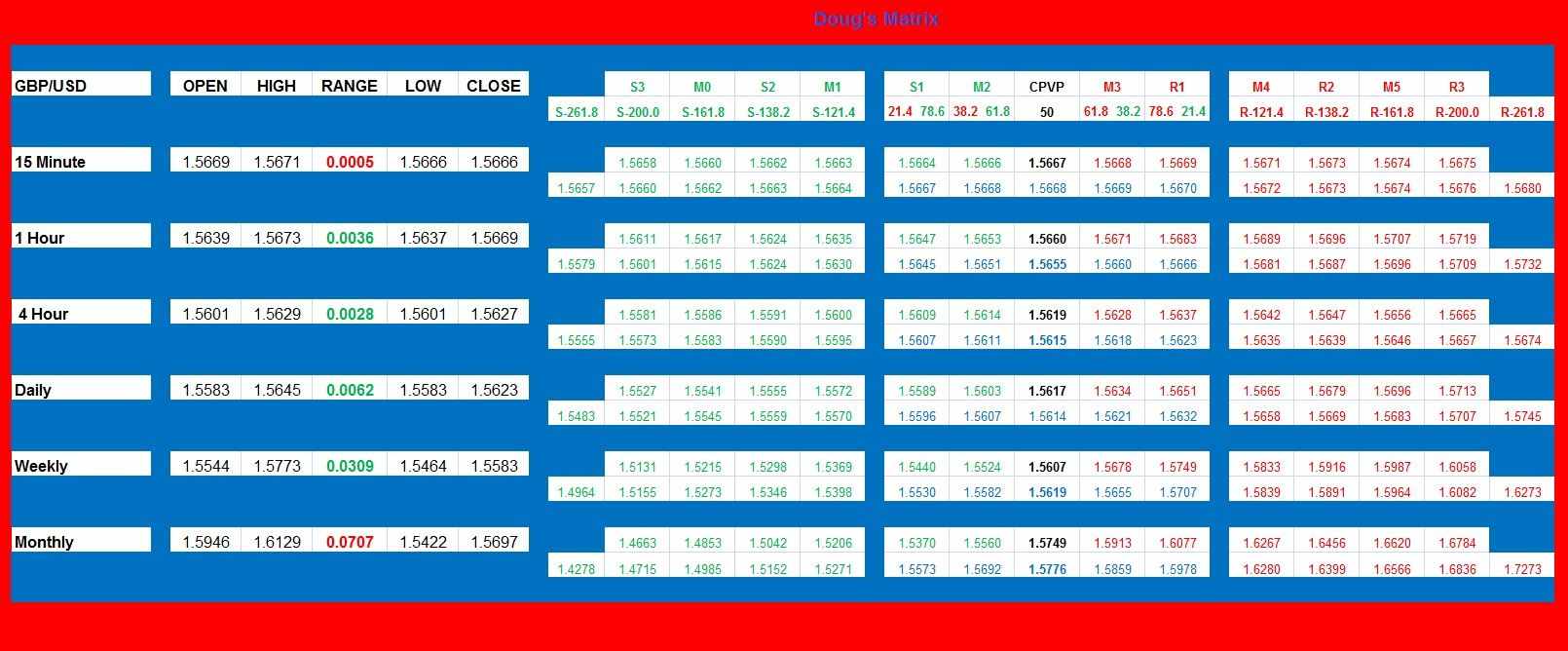 On the hourly timeframe the upper Bollinger band is wide open and pointing up so at the moment it is on to to the upside until we hit the resistance we need to send price back down and cop our short. If and when price breaks above the 1.5678 level which happens to be the weekly M3 then pulls back and makes a retest, I would look to enter longs to 1.5749 but don't get married to that long because you will need to look for shorts around 1.5749 and please bear in mind that when we reach 1.5745 price will officially be at its max since that is the 261.8 fib extension of yesterday's range.