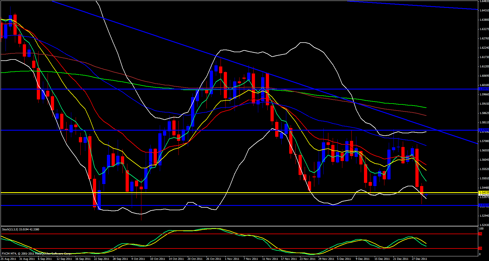 Yesterday the GBP/USD broke below a very strong area of support at 1.5424 It then fell down to another level of support just above 1.5432 then profit taking kicked in and price bounced up and what was support may have reversed roles and may now be resistance and could begin to drop from where it is. The lower Bollinger band has opened and is pointing down. The daily 5 ema has crossed below the 13 and 21 ema's and price has permission to drop.