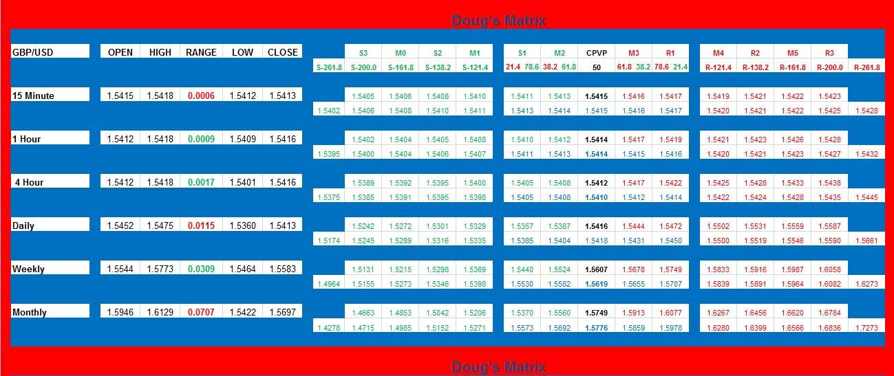 Provided is my Support & Resistance table referred to as Doug's Matrix. It is a very complex calculation system of my own design that displays areas of support and resistance that will most likely be observed by the market. Use it to your advantage. It will get you into safe trades and keep you out of the bad ones.