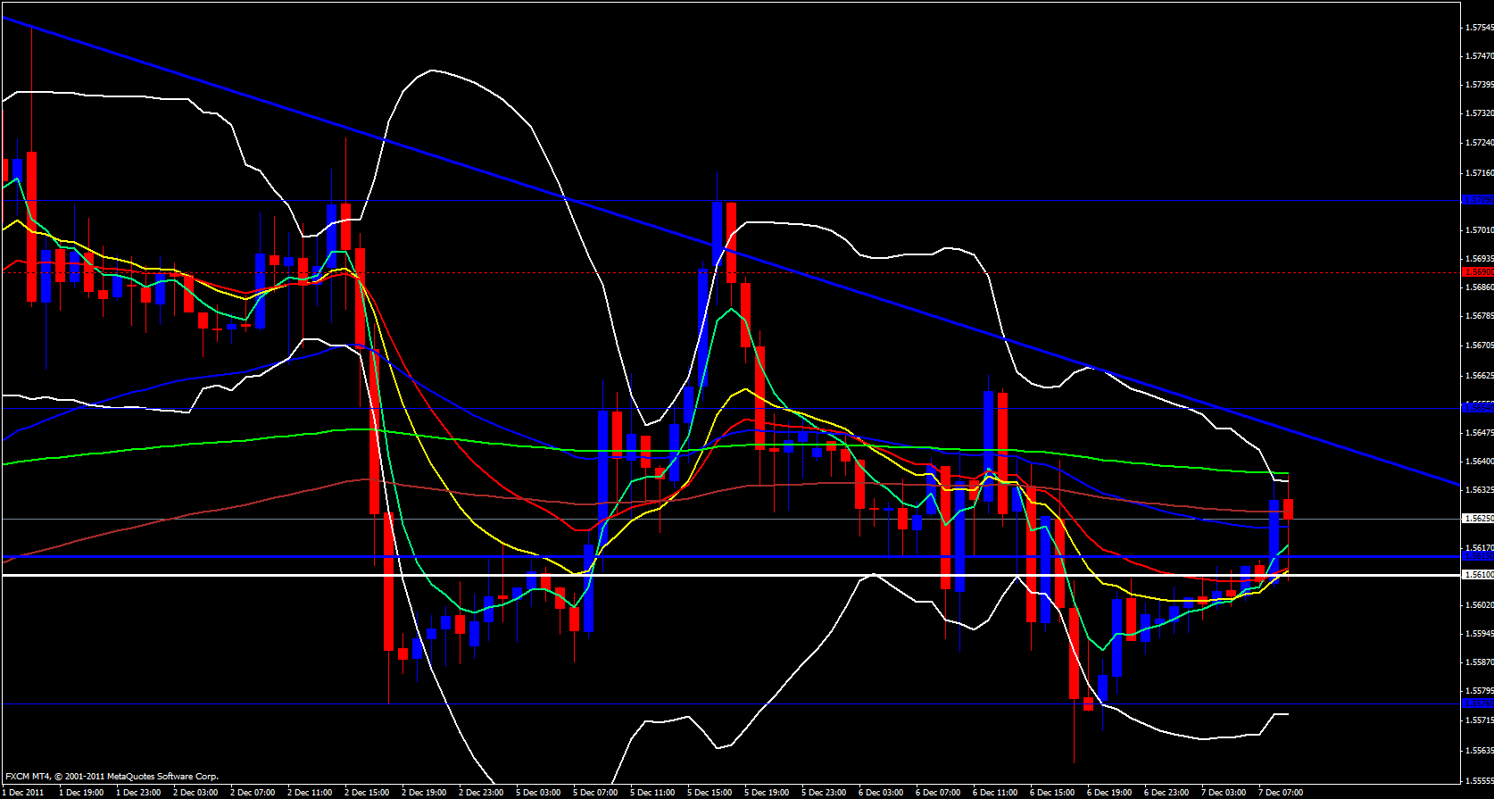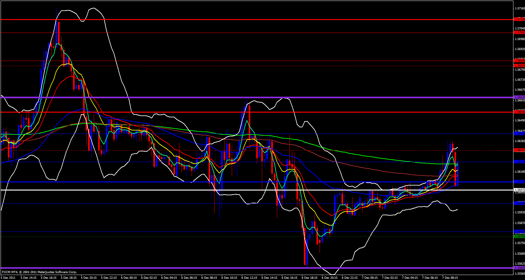Finally, on the 15 minute time frame price has been trending up gracefully riding its way up the ema's and has broken above the 233 ema. I am bullish above 1.5655 but if price cannot break that level I will be watching for shorts.