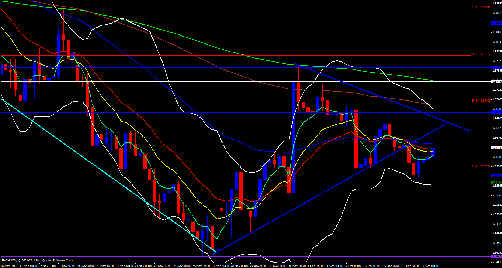 On the 4 hour time frame price has broken out of a triangle price trap as I forecasted yesterday and has headed back up to make a retest but we will need to see if price re-enters the triangle and keeps heading up or if it makes a lower low below 1.5560 Price recently touched the 55 ema overlapped with a subtle 61.8 swing fib and was immediately rejected.