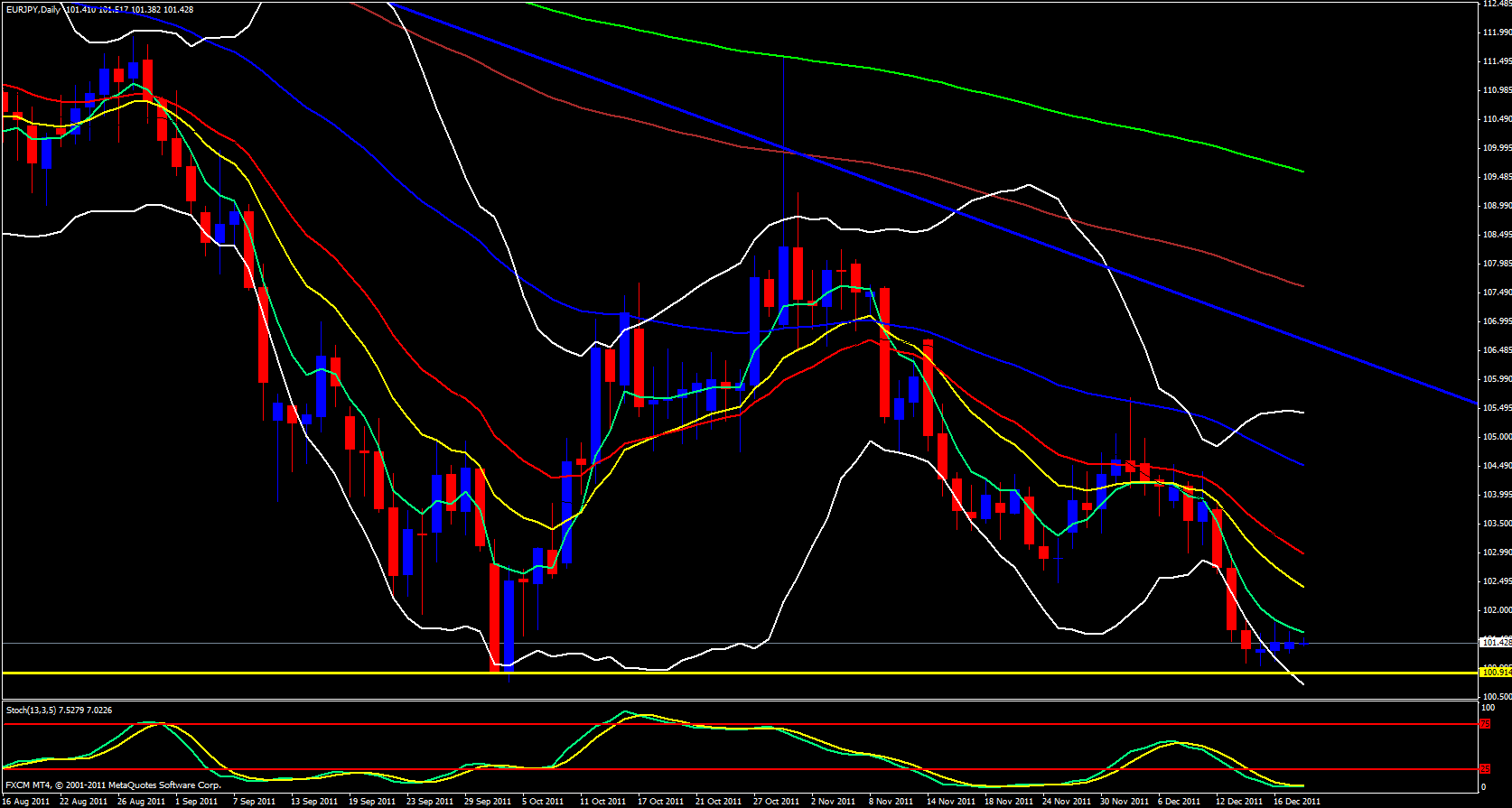 Yesterday was an exceptionally weak day for the EUR/JPY. Only a 37 pip day for this pair. Last few trading days we have been in a tight range and not really going anywhere. On the daily time frame I can only say that price is still below the 5 ema and about 50 pips above visual support that won't be broken so easy. Stochastics is also in the oversold zone.