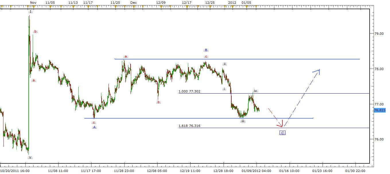 Description: I do see a good opportunity to buy and hold the Japanese Yen at the moment. As we can notice in my simple chart that Flat correction is almost getting at its end with a motive wave C. I do expect a turn in trend once the last wave C reaches 1.618 Fib Level (as shown) at price level 76.316. If the wave was a larger ABC correction that comes after larger wave V or a new trend is unfolding, I do expect a bullish movement in both cases this week and the next. I will buy and hold the currency with a good price level at this point looking to sell it in a higher price.