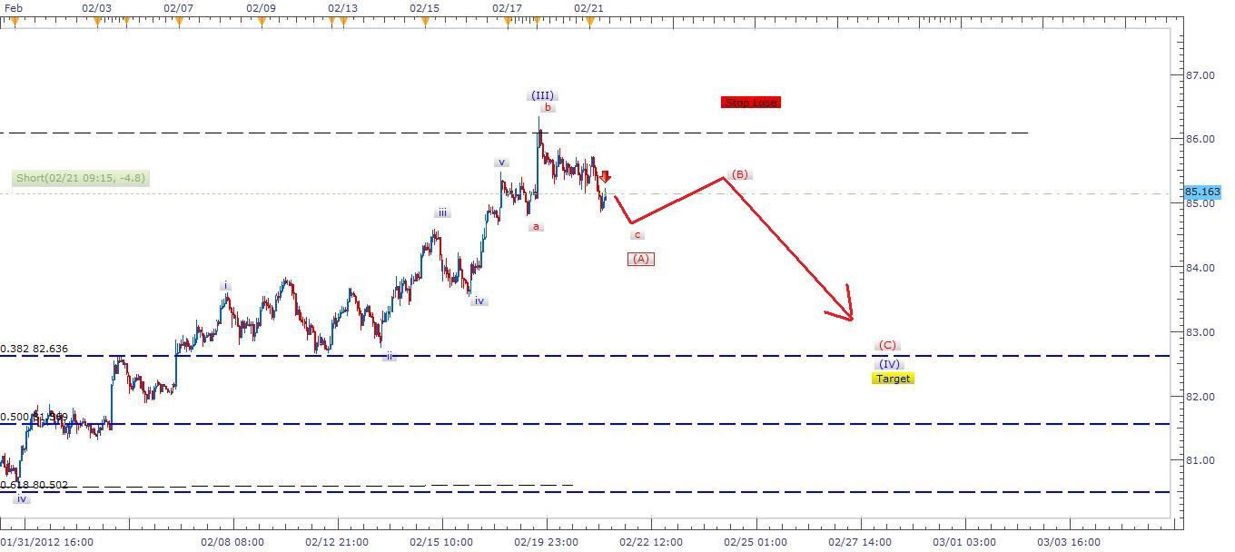 Description: Major trend for AUD/JPY is going into a probably a simple correction due to the double zigzag in wave (I)&(II), or probably into a more complex wave. Although this cycle is a bit risky, but as a speculator, We can benefit from the slow momentum by shorting the pair. The end of wave v in (III) ended with expansion flat which I will consider wave (A) of (IV). Without getting into much technical details here using Elliott waves count, I would follow the drop and watch the progress. Best of Luck!!