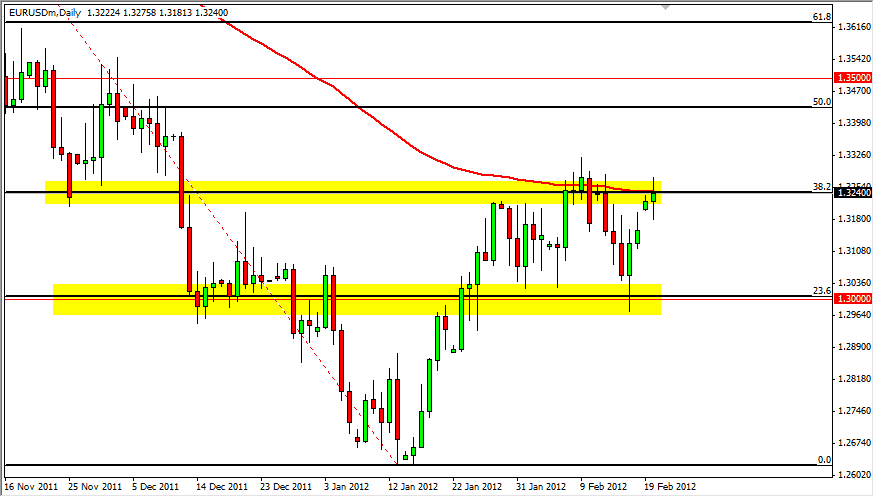 The 1.3250 area is also the 38% Fibonacci retracement of the latest large down move, and this area should continue to act as resistance. I see the area as being strong, and the “noise” associated with the area between there and 1.35 really has me doubting the buying of this pair. It isn’t that the pair can’t go higher, surely it can, but the fact is that the move will be choppy at best. The 1.34 area is the 50% retracement area and the start of that resistance area centered at the 1.35 handle. With this in mind, I am again looking for a weak candle to sell from the top of the current consolidation range. The 100 EMA is sitting just above as resistance as well, giving me yet another reason to be suspicious of the bullish scenario.