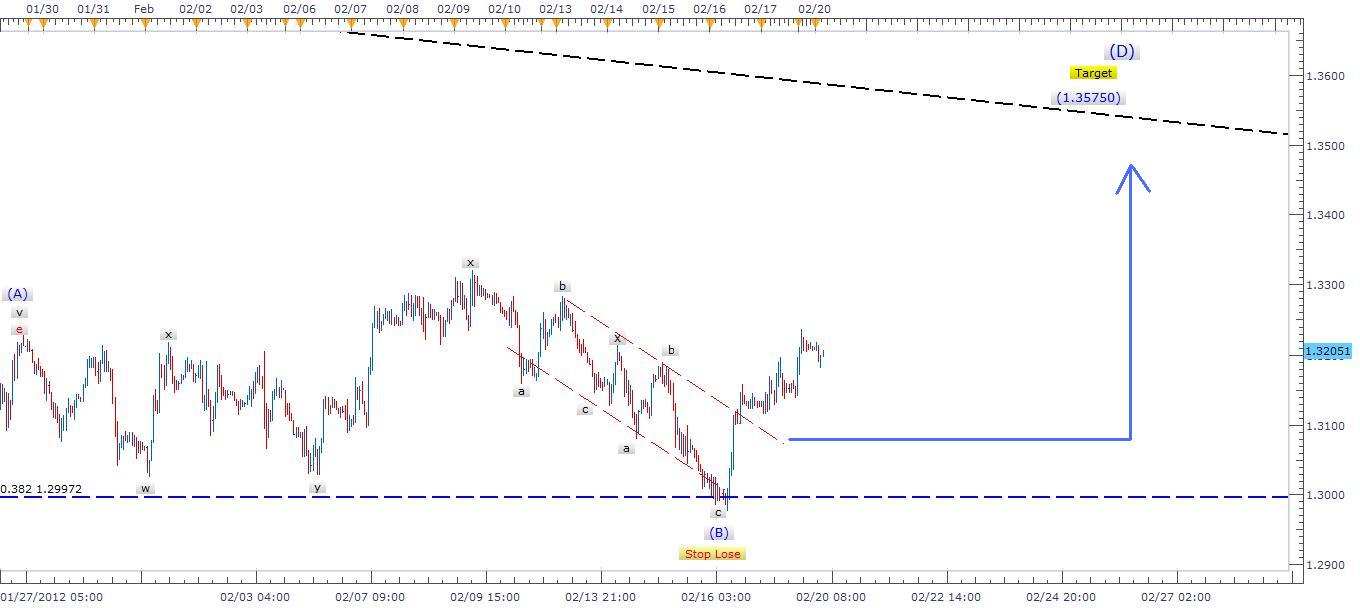 Description: In a larger Zigzag within a falling channel, wave A, and complex B completed at 1.29733. Now wave C start progressing heading toward the black trend line which should be the same length or slightly less than wave A. Momentum is still there and I will keep riding the wave with open target at the moment because I know it will become very risky once price get into 1.34 and 1.35 range. I will decide again when the wave progressed in the coming day or two and see how mass market react.