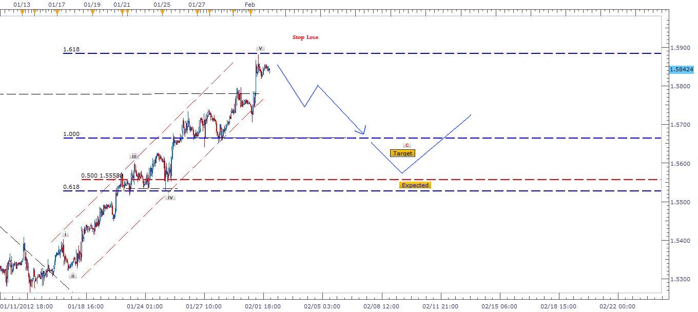 Description: Pair reached wave A max at 1.618 Fib level. I expect a falling zigzag with a soft target @ 1.56700. I will short currency at this level. It is a correction wave within correction. We will figure out what type of correction soon it starts falling.