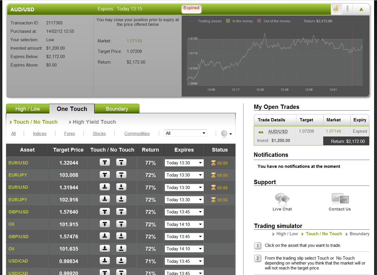 At 13:00 the market price was 1.32038 and I got the strike price 1.31969. After only 2 minute (!!) the market touched the strike price and I won 1078$ on my investment.