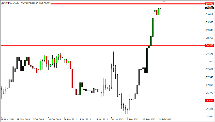 The level just above is the 80 handle. There is an obvious support zone from the middle of 2010 to the middle of 2011 at this area, and as a result I am expecting massive resistance as well. In fact, the central bank interventions have all stopped shy of this level, and this suggests that there is an outrageous amount of resistance and sell orders in the area. Because of this, I believe we are at one of the most important spots in this market currently.