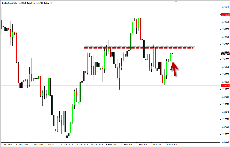 The candle for the session on Tuesday looks like a hammer that is trying to burst through the 1.3250 resistance level, and judging by the way the Euro seems to defy gravity at times, this wouldn’t surprise me. However, if we get a break through the bottom of the candle – it becomes a very bearish signal as it would turn the candle into a “hanging man”. Because of this, it sets up a reasonably simple trade in my eyes.