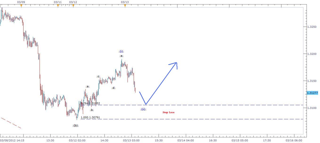 Description: Looking at the overall picture of EUR/USD, We can notice a clear falling channel where the current trend is traveling in wave E or to its last destination. I can not decide where the currency are going to land in a week or two from now but I can predict it later when more waves unfolds. Now looking into a little details in the current correction that probably divide wave (a) from (c) and to keep in mind that the stream is going down, A two Zigzags completed a flat correction as only a prediction and a leading diagonal let's say as of wave i. In such scenarios, wave ii fall down to .0764 before it proceed for wave (iii). In this regard, I would wait until price 1.31060 and buy on the bounce for further wave (iii) until wave (v).