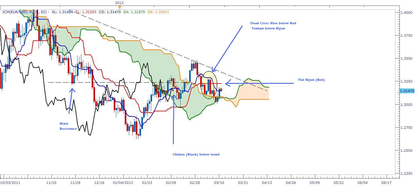 Description: Looking at EUR/USD from different type of analysis (Ichimoku Kinko Hyo) and Candle Sticks, A Bearish Engulfing crossed kijun sen (Red) just above Kumo (Cloud) which indicate a turn in trend from Bullish to Bearish with a dead cross Tenkan below Kijun (Blue below Red). We can notice also that Kijun went into a flat shape which indicate a solid resistance level that matches the resistance in November 28, 2011 (Blue arrow). Now what confirm the bearish signal at last is the black Chickou (Black) of the past 26 days crossed and went below actual trend. I do suggest traders to either short and hold the pair with open target or to wait until price bounce to a higher level near 1.32450 or 1.32300 and action the short call. This trade might throughout the week.