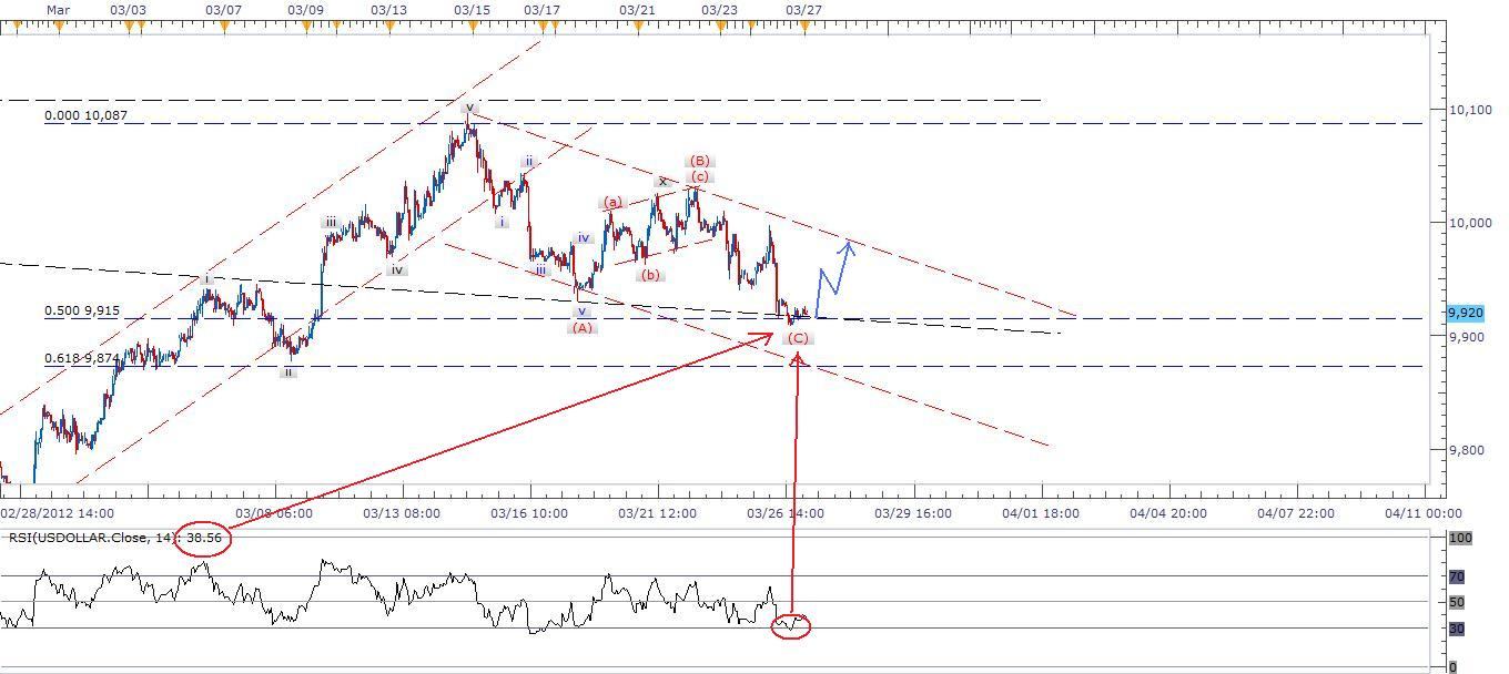 Description: I would like to share with you my thought of US Dollar expected move because it will effect my yesterday trading signals for EUR/USD and EUR/JPY. A completed Zigzag correction fall off 10,087 down to 9,910 testing 0.50 Fibonacci level with a 27.65 RSI which considered in over sold position. This scenario indicate a larger wave II is probably in place and wave III to come in weeks to come! If my prediction was accurate, that will pull back EUR/USD and EUR/JPY down as expected yesterday. By keeping this in mind, I would hold my short positions for both pairs (EUR/USD, EUR/JPY) with their stop lose levels and waiting for economic news to shake the market to predicted direction. Stay tuned!