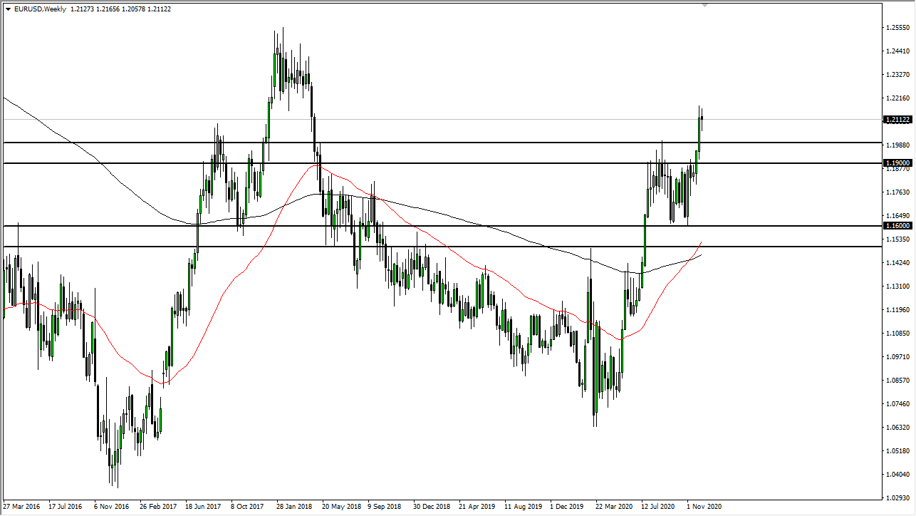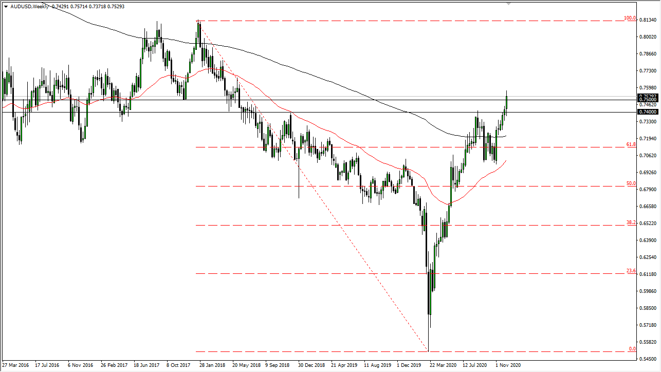 AUD/USD fell during the week, but is currently grinding sideways overall. After the massive uptrend that the pair has been in, the pair needed time to consolidate in order for the buyers that hadn’t been able to go long earlier. The 1.06 level should continue to hold up as support, but if it doesn’t – the 1.04 level is even more supportive. Between the two areas, support should reappear for the Aussie, and a break of the 1.08 level is more than likely coming. After that, we should see the 1.10 area tested. Currently there is no need to short this pair from where I am looking.