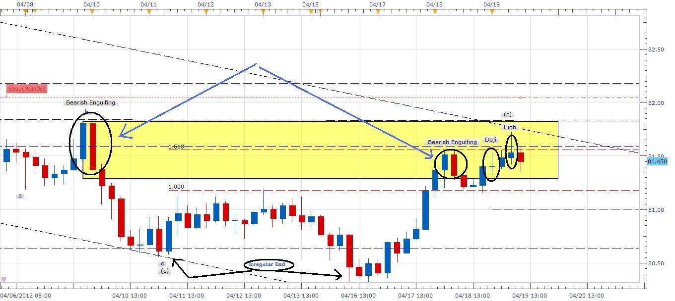 Description: Just looking at 4H chart, we notice the long bearish engulfing candles that created a strong resistance level pull the trend down to a bottom near 80.50 with irregular End that bounced the trend up to 1.618 Fibonacci level with another smaller Bearish engulfing pattern which create a double top level followed by a Doji and a high spike candle just below 1.618 Fibonacci. All we need is a confirmation to pull the trend back down and that is a red candle that fall below the Doji level near 81.360. However, I will change the target level and set it at or near 81.00 for a short trade. Anyways, I do think this is the final battle between Bulls and Bears at this stage and we all need to pack our stuff and turn the mode to a bullish strategy.