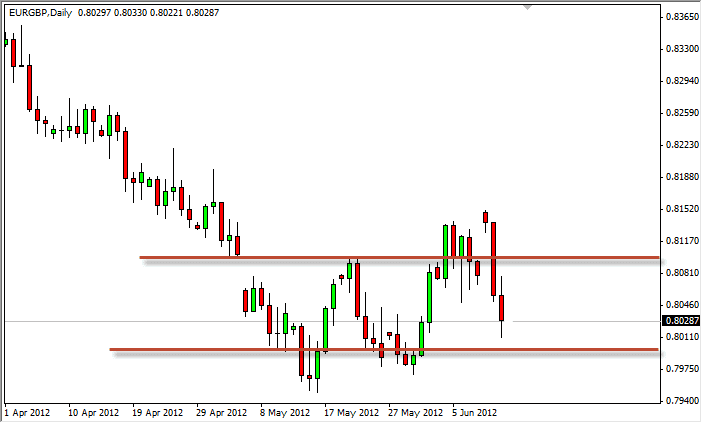 The recent action has seen a bit of a consolidation in between the 0.81 and 0.80 handles. This pair likes to grind slowly at times, and as a result this isn’t much of a surprise to me. The pair looks like it wants to fall again, but the 0.80 level below is actually a long term support and resistance level going back years and a bit of an equilibrium in this market to boot. This makes the area that we are trading in very important, and as a result a breakdown from here could quickly turn this pair into a long term sell waiting to happen. On a daily close below the 0.7950 level has been shorting aggressively as I think 0.75 would be the next stop. As for buying, I can’t do it as there are simply far too many headline risks in Europe at the moment.