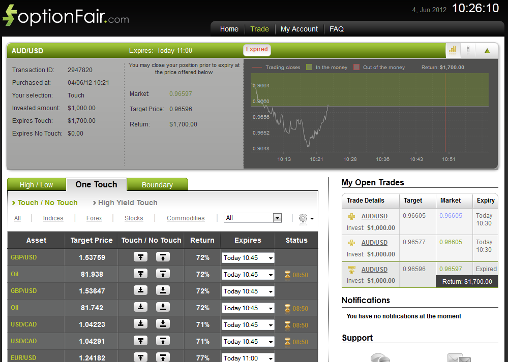 According to Colin Jessup's analysis of the AUDUSD, the pair is heading down. That creates an investment opportunity on the following instruments: “High", "Touch", "No Touch Down" and “Above". I logged in the optionFair™ Binary Options Trading Platform and I traded $1,000 on the “Touch” instrument.