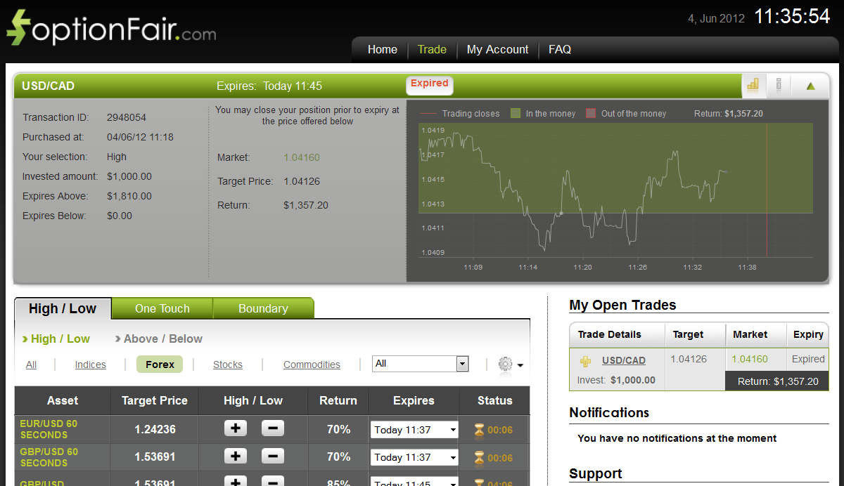 I logged in the optionFair™ Binary Options Trading Platform and I traded $1,000 on the "High" instrument. This kind of option has a return of 81% if the option closes above the target price, meaning if the signal is correct I could get a return of $810 on my investment.
