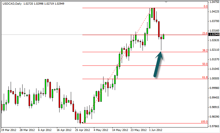 The hammer from the session on Thursday is formed just at the 38.2% Fibonacci level, and looks like we are going to continue the uptrend this pair has found itself in lately. The 1.05 level will be targeted sooner or later, and I think that a new high would signal that this pair is ready to climb to much higher levels.
