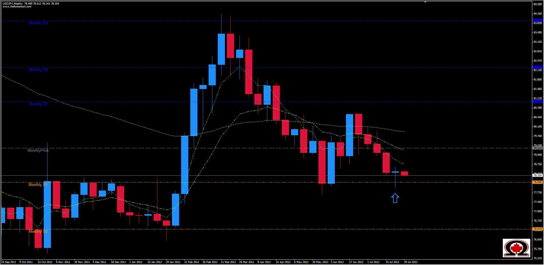 The USD/JPY has been, like the EUR/USD, rather disconnected from the '6 Cousins' when viewed from a market correlation point of view. There are some unofficial rules when analyzing the Forex Markets, one of which is that if the EUR/USD, GBP/USD & AUD/USD all tend to go in the same overall direction, and when they are all going in one direction on a daily chart, then the USD/JPY, USD/CAD & USD/CHF can be seen going in the opposite direction overall. That is not the case with the USD/JPY which has been doing its own thing lately, and last week is a good example. On Thursday & Friday for example, the GBP/USD and the USD/JPY charts were both going up, while the USD/CAD & USD/CHF were both going down. Where the USD/CAD weekly chart printed a strongly bearish candle at the end of the week, the USD/JPY printed a slightly Bullish Reversal candle on the same time frame, indicating that the USD/JPY might be heading higher and the Japanese Yen might be weakening once again against the US Greenback. The candle printed on a zone of support at 78.09 (Monthly S1) which is a zone the pair has struggled with many times recently, from mid July 2011 to February 2012 and again in the beginning of June this year when it hit a low of 77.65 before reversing and rising to 80.559 before once again falling to re-test this region of support. When viewed in a context of the overall trend, it appears to be more of a 'speed bump' than a reversal, and the pair will possibly simply fill the tail after consolidating or 'taking a breath' before heading lower. If the low of the tail at 77.931 is breached, there is roughly a 1500 pip technical vacuum below with only the 77.50 level offering much in the form of support on the way down. If price does break higher there are several Resistance zones on the way up including 78.79, 79.09 & 79.52 with the Monthly Pivot at 79.329.