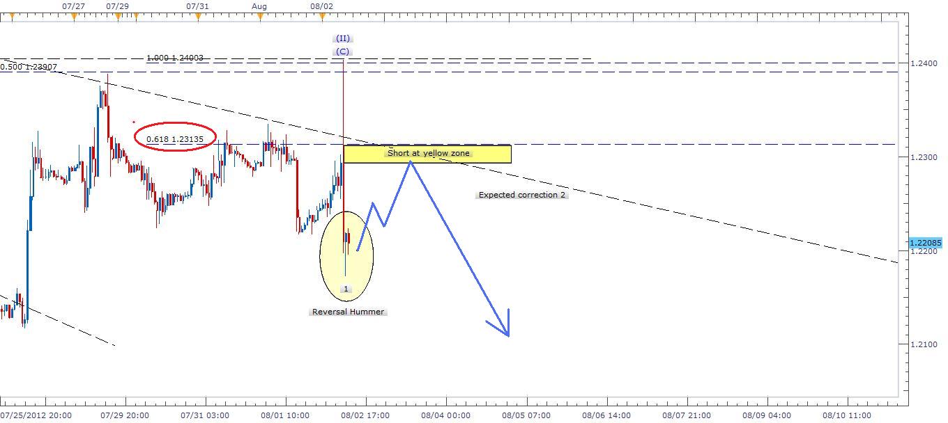 Description: In technical view the pair has formed a motive wave after it retraced 50% of the previous major drop (I) that started on 20 Jun at 1.27240 ended on 24 July at 1.20450. With a correction pull back that hit 50% at 1.2400 a spike took action down to 1.21720 which I assume as a new start of wave 1. If my assumption is correct, a correction should retrace 0.618 up to or near 1.2300 almost a 100 pips. If that scenario happened, I will plan to short the pair one more time with open target for expected longer wave (III). Lets watch the movement for now and decide accordingly.