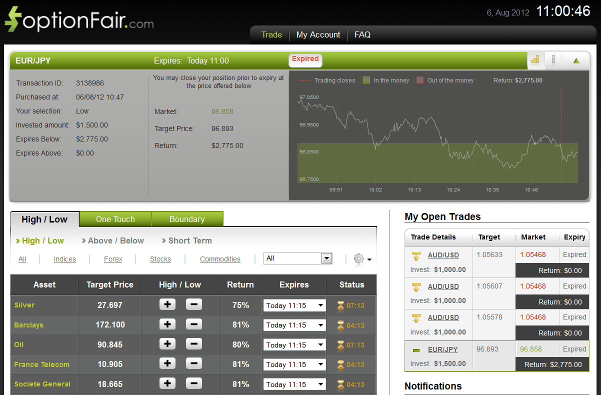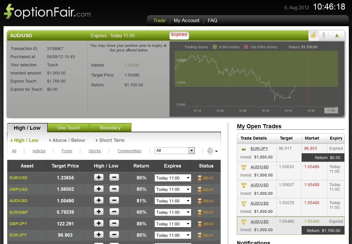 I logged in the optionFair™ Binary Options Trading Platform and I traded $1,000 on the "Touch" instrument. This kind of option has a return of 70% if the option touches the strike price prior to the expiry means the signal is correct, I could get a return of $700 on my investment.
