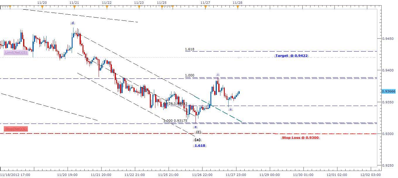 Description:Follow up on my yesterday post on CAD/CHF, A break in falling channel took place yesterday for new fresh wave expected to reach a new high levels. Yesterday the trend completed wave i and corrected ii at 0.618 Fibonacci at 0.93441. It looks attractive to me to buy and hold the pair targeting 1.618 Fibo expansion at 0.94200 price level.