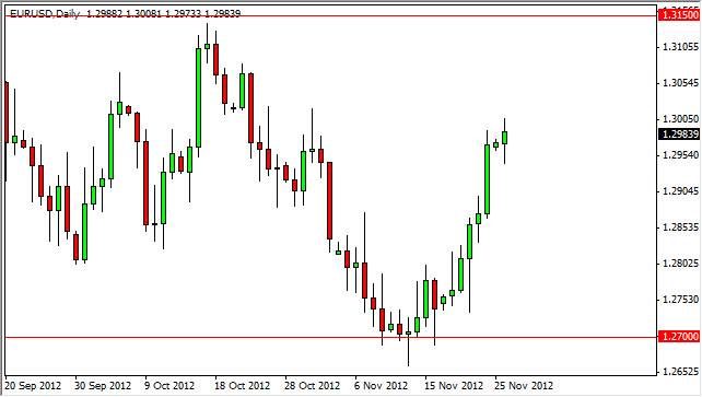 The EUR/USD pair had a relatively quiet session on Monday, as traders came back to more liquid markets after the US Thanksgiving holiday the previous week. The market fell somewhat, but found enough support at the 1.2950 level that it now looks like the Euro is very comfortable 1.30 on the whole.