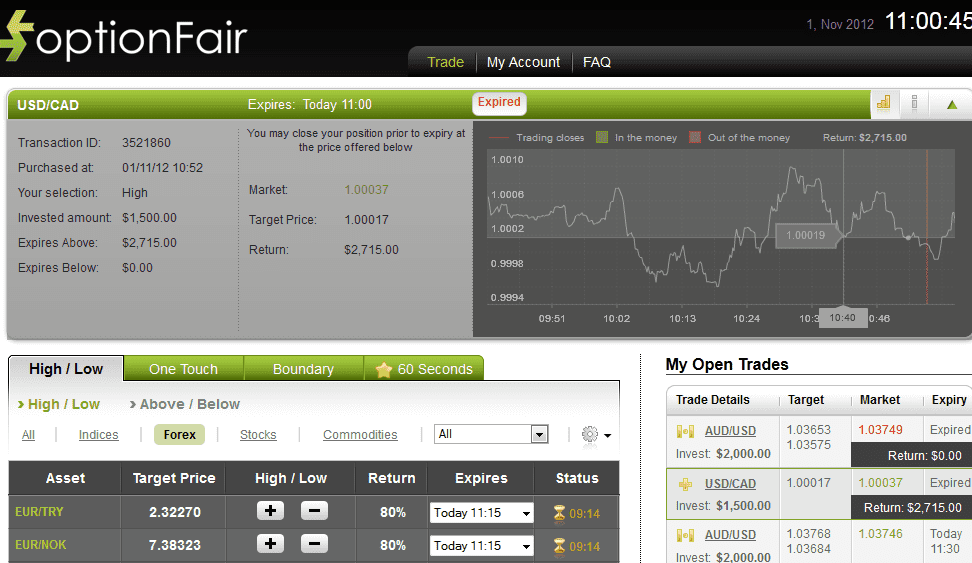 The target price for USD/CAD at the buying time (10:52 am) was 1.00017 for the expiration of 11:00 am. The asset closed on 1.00037 and I was able to make $1215 in less than ten minutes.