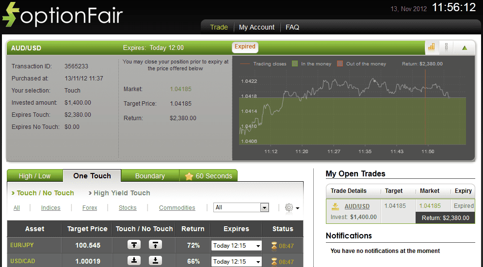 With optionFair trading platform, I traded $1400 on the “Touch Down” instrument. This kind of option has a return of 70% if the option will hit the strike price prior to expiry, which means that if the signal is correct I could get a return of $980 on my investment.