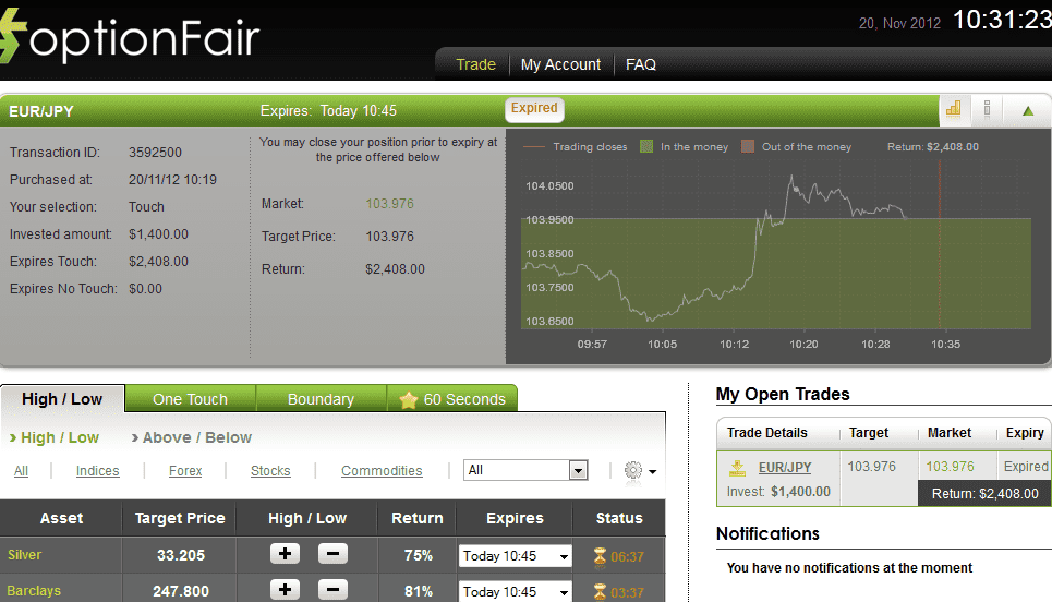 With optionFair’s trading platform, I traded $1400 using the “Touch” instrument. This kind of option has a return of 72% if the option touches the strike price prior to the expiry time; that means if the signal is correct, I could get a return of $1008 on my investment.