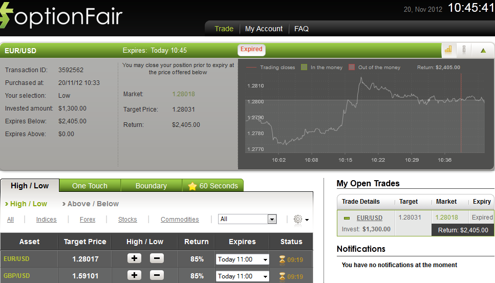 I logged onto the optionFair trading platform and traded $1300 using the "Low" instrument. This kind of option has a possible return of 85% if the option will close below the target price, which means that if the signal is correct I could get a return of $1105 on my investment.