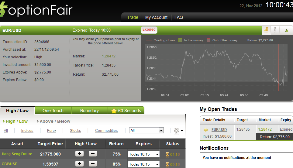I logged onto the optionFair trading platform and traded $1500 on the "High" instrument. This kind of option has a possible return of 85% if the option will close above the target price, meaning that if the signal is correct I could get a return of $1275 on my investment.