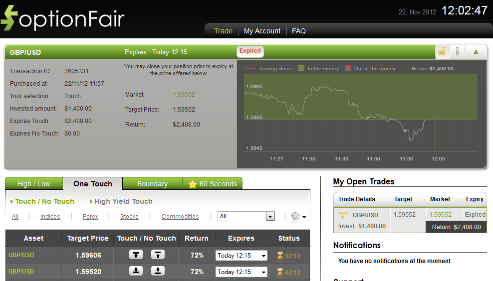 With optionFair’s trading platform, I traded $1400 using the “Touch” instrument. This kind of option has a return of 72% if the option touches the strike price prior to the expiry, meaning that if the signal is correct, I could get a return of $1008 on my investment.