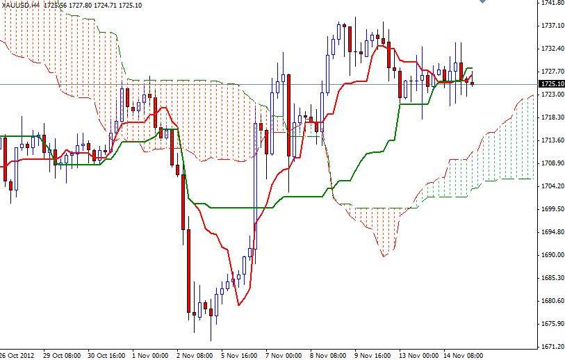 XAU/USD (gold) has been range bound since Friday. After yesterday’s choppy session, the pair looks like it is trying to wind up for a move as the range keeps getting tighter. 4-Hour chart shows the battle between the bulls and the bears intensified in the 1732 – 1720 zone. Some investors seeking to hedge against currency weakening continue to choose this precious metal to park their cash. Also developments in the Middle East increased demand for this precious metal. On the other hand, worries over Greece’s next bailout installation, uncertainty over whether Spain will seek a bailout and fears that growth in China was slowing remains supportive for the U.S. dollar. Therefore, the primary driver of gold prices in coming days looks likely to be the headlines from the United States. With this in mind, I expect CPI numbers and manufacturing data out of the U.S. today will have high impact on XAU/USD. For now the 1720 level looks supportive but 4-hour chart is turning bearish as Tenkan-sen line (nine-period moving average, red line) crossed below the Kijun-sen line (twenty six-day moving average, green line).