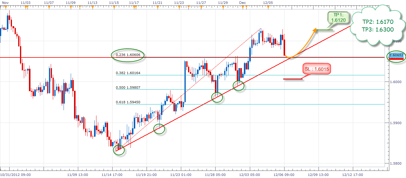 Description: the GBP/USD Has hit the 23.8% Fibonacci level at 1.6060 which is also a resistance level in this case. The price is also near the uprising trend line which makes this a good point to enter a long position on this pair.