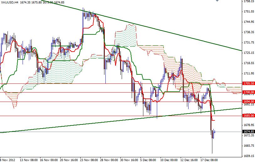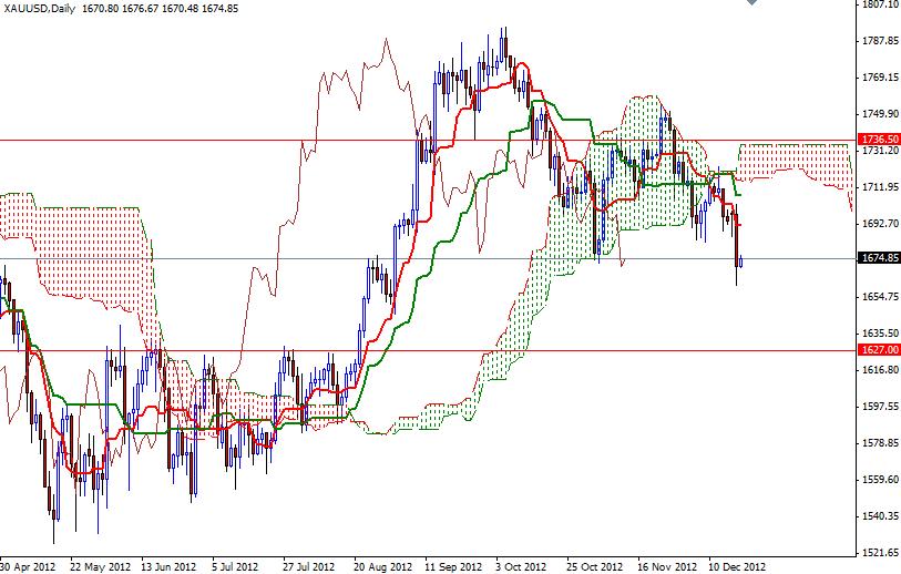 Gold prices fell hard yesterday after media reports that President Barack Obama made a new offer to House of Representatives Speaker John Boehner to avoid a U.S. fiscal cliff of spending cuts and tax rises in January. XAU/USD (gold vs. the American dollar) traded as low as 1661 before retracing back to 1674. The U.S. budget negotiations have been driving the gold market’s bearish activity. The recent price action shows that progress in negotiations will continue to weaken interest in gold. I also believe that low market volume and year-end profit taking will be negative for the precious metal. Looking at the charts from a purely technical point of view, the odds favor further drop. Prices remain below the Ichimoku cloud on the daily and 4-hour time frames.